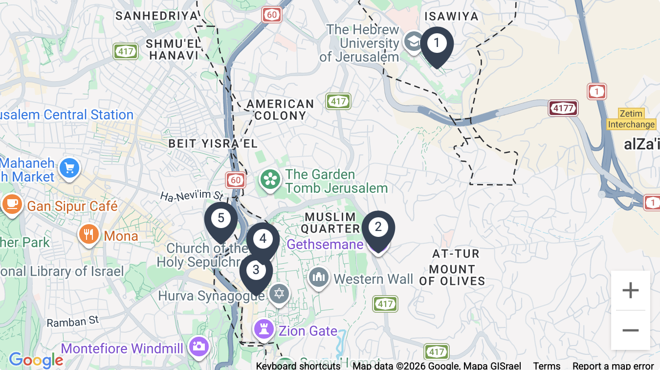 Take in Jerusalem at the Mount Scopus outlook, then follow the triumphal route of Jesus down the Mount of Olives to the Garden of Gethsemane.